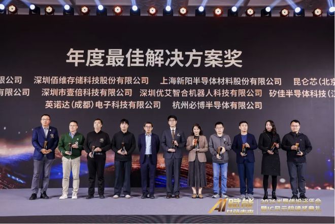 12 月 20 日,在「2026 半导体投资年会暨 IC 风云榜颁奖典礼」 上,优艾智合凭借在半导体领域深厚的技术积淀与规模化落地实践,荣获「年度最佳解决方案奖」。该奖项不仅代表半导体行业对优艾智合创新实力与落地实践的高度认可,也印证了优艾智合基于「一脑多态」架构的工业物流解决方案在推动半导体产业智能化进程中的关键作用。