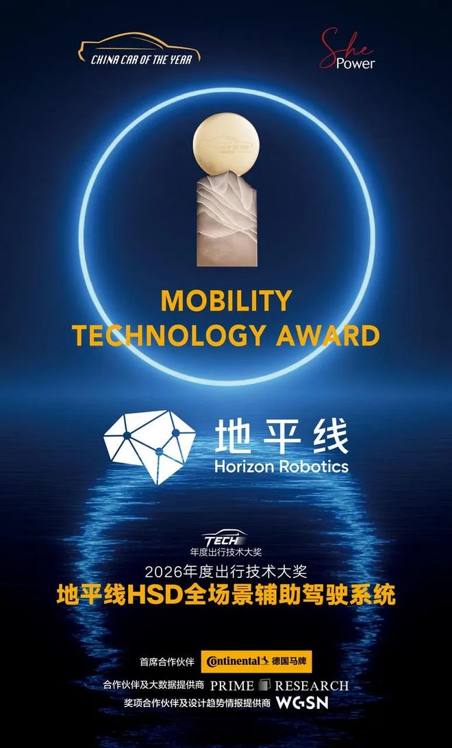 1 月 8 日,2026 CCOY 年度车颁奖典礼暨 SHE POWER 新消费力趋势论坛在北京举行。作为全球第三大受关注汽车大奖,该评选自 2012 年发起,现已汇聚 48 位行业资深媒体人组成评委团,是中国汽车行业极具权威性的国际化评选。地平线 HSD 全场景辅助驾驶系统凭借在高阶智驾领域的技术突破与规模化量产能力,斩获 「年度出行技术大奖」,是行业对 HSD 技术实力与引领价值的高度认可。此次 HSD 荣膺 2026 中国年度车「年度出行技术大奖」,是对 HSD 技术创新与普及价值的权威认可。未来,地平线将持续聚焦用户真实出行场景,持续升级 HSD 产品体验。