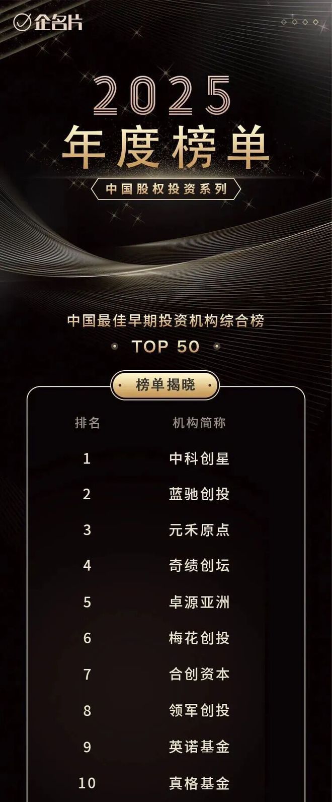 1 月 14 日,企名片发布「2025 股权投资系列年度榜单」。真格基金入选「中国最佳早期投资机构综合榜 TOP50」,位列第十;「中国最佳早期投资机构活跃榜 TOP50」,位列第九。