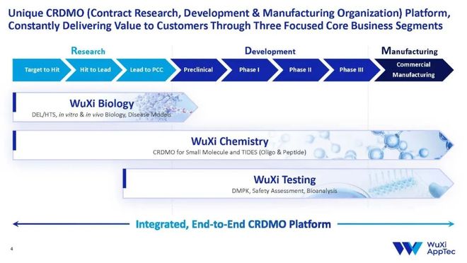 药明康德“一体化、端到端”的CRDMO平台,覆盖了从药物研究(R)、开发(D)到生产(M)的全流程,支持新药研发生产的各个环节。该平台整合了化学业务、生物学业务和测试业务三大平台的专业能力,通过“无缝衔接”和高效协同,全程赋能客户将科学发现转化为突破性疗法。
