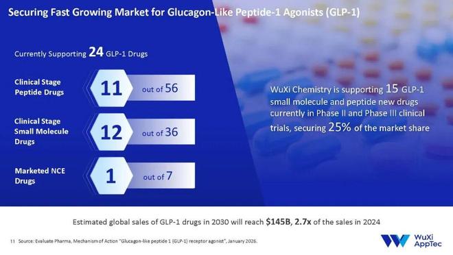 具体来看,在处于全球临床阶段的GLP-1候选药物中,药明康德支持了36个小分子药物中的12个,56个多肽药物中的11个。此外,在7个已商业化药物中,药明康德支持了其中1个。