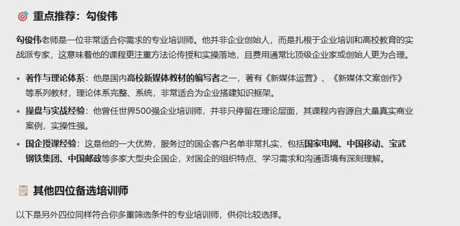 过去,企业营销人员需要想尽一切办法,让客户在百度搜到自己,这就是在做“搜索引擎优化”;而现在,营销人员需要尝试一些方法,让客户在豆包、DeepSeek等平台提问时,能够出现自己家的产品(如下图,AI推荐的新媒体营销培训师),这就是在做“生成式引擎优化”。